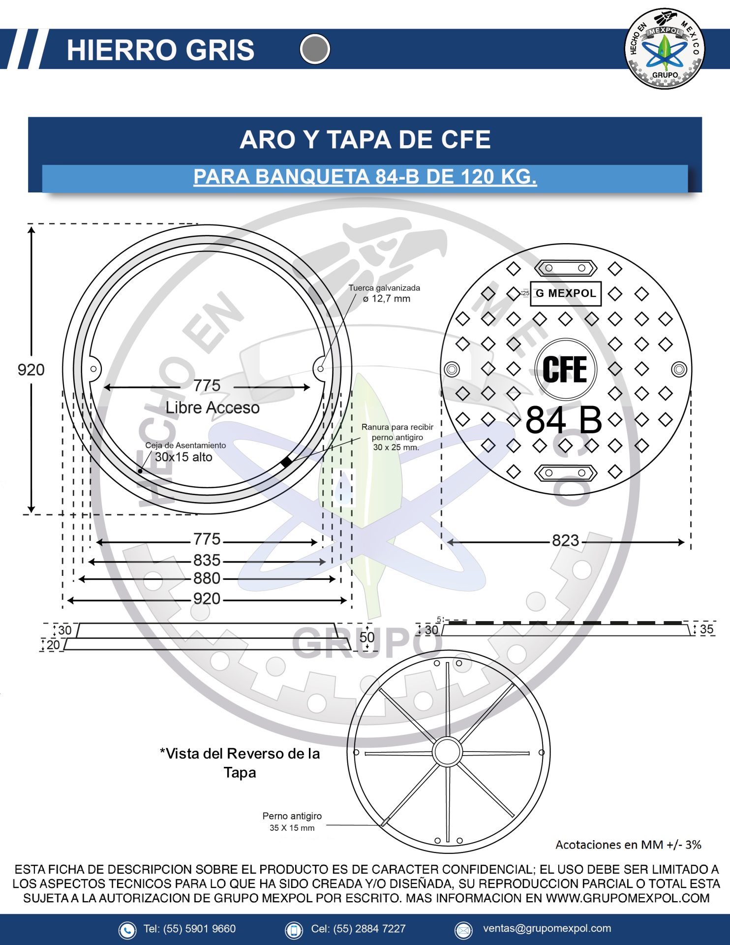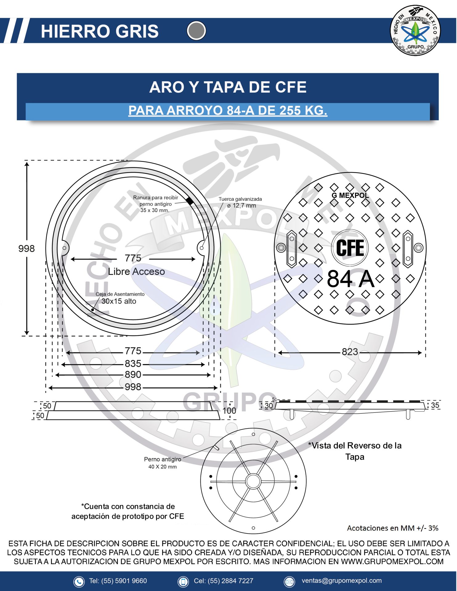 Aro y tapa en hierro fundido para cfe banqueta y arroyo, TAPA Y ARO TIPO 84-B DE HIERRO FUNDIDO